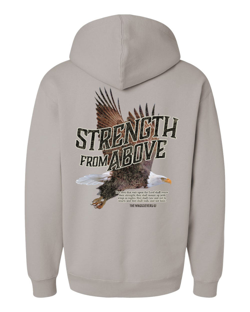 The Whosoevers Strength From Above Pullover Hooded Sweatshirt Features A Left Front Chest Print And A Large Screen Print On The Back. It Also Includes A Kangaroo Front Pocket And Drawcord Hood.